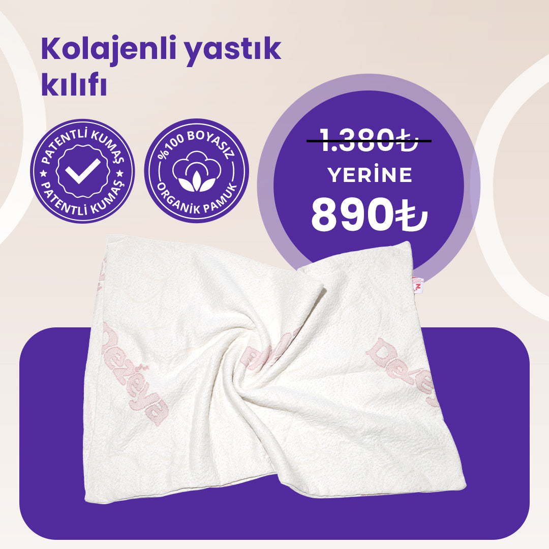 Dezeya'nın devrim niteliğindeki Collagen Beauty Yastık Kılıfı ile uyurken güzelleşmeye başlayın. Cilt sağlığınızı desteklemek üzere özel olarak tasarlanan bu yastık kılıfı, içeriğindeki kolajen lifleri sayesinde siz uyurken cildinize ihtiyaç duyduğu bakımı sunar. Kolajenin doğal yenileyici özellikleri, ince çizgi ve kırışıklıkların görünümünü azaltmaya yardımcı olurken, cildin nem dengesini koruyarak sabaha daha canlı ve pürüzsüz bir ciltle uyanmanızı sağlar.